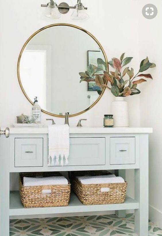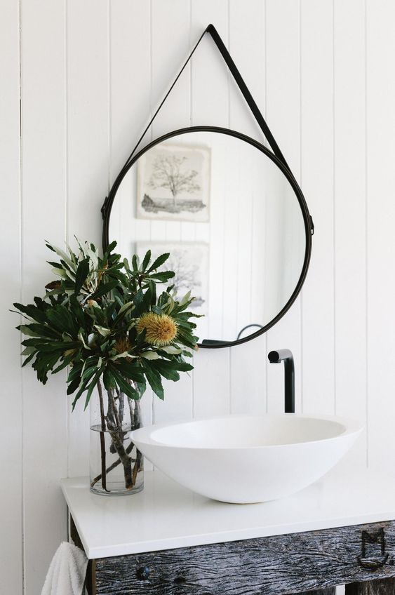 Rather than installing a built in mirror, consider buying a statement mirror that will help to define the style of the bathroom and also bring in either colour, and/or texture to the space.