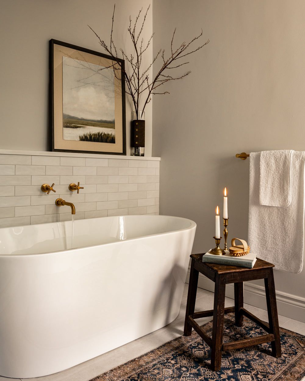 Candles are a classic styling accessory and look good styled in groups of three. Large dishes of different soaps, baskets for guest towels and simple silver trays to contain bathroom items or a vignette are ideas to consider.
