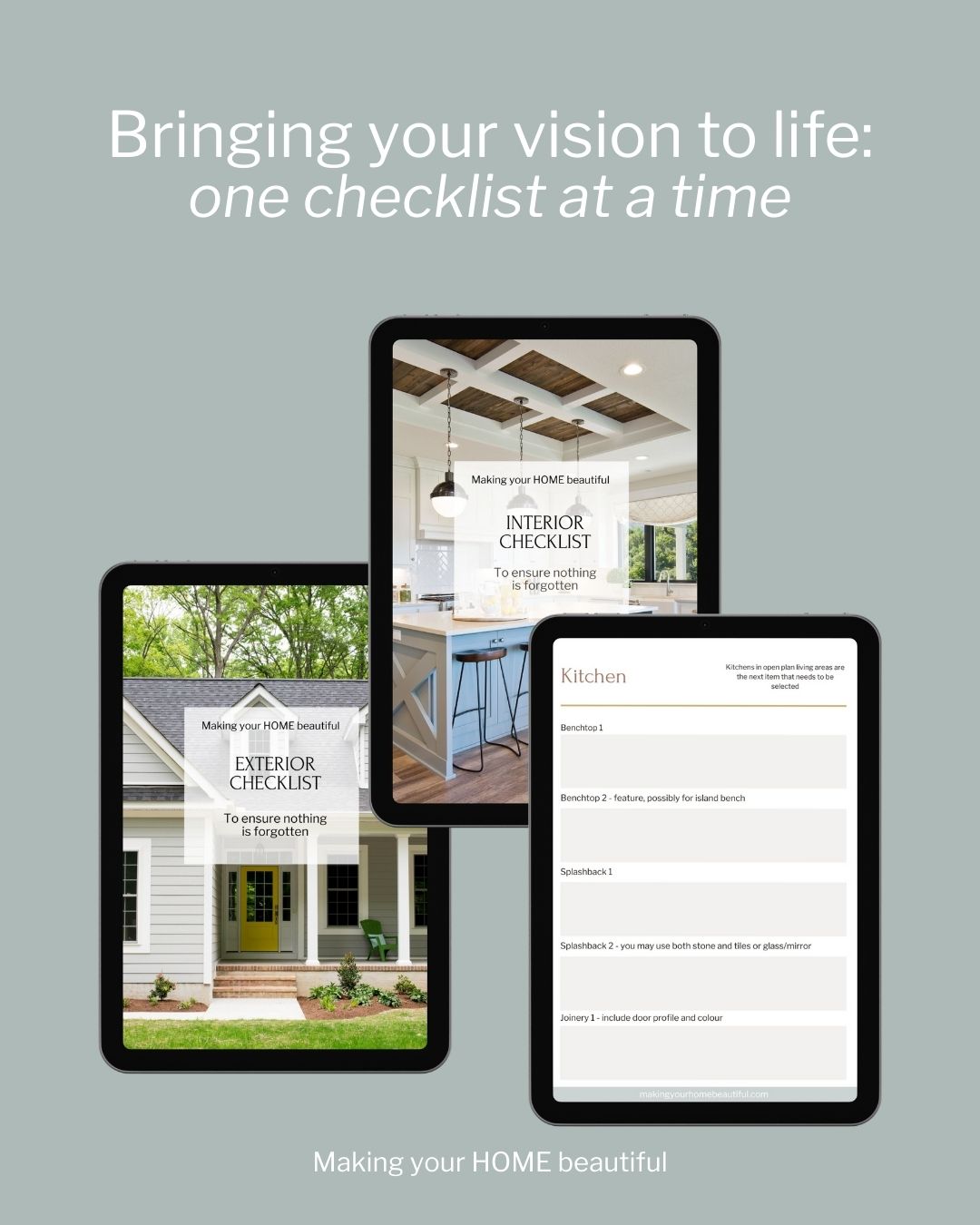 If you are building a new home or renovating the one that you have, you should purchase my checklists. You will find all the elements of a new build or exterior and interior renovation that you need to consider, with plenty of space to write down supplier and product details for reference. Gain control and satisfaction when you can check each one off the list.