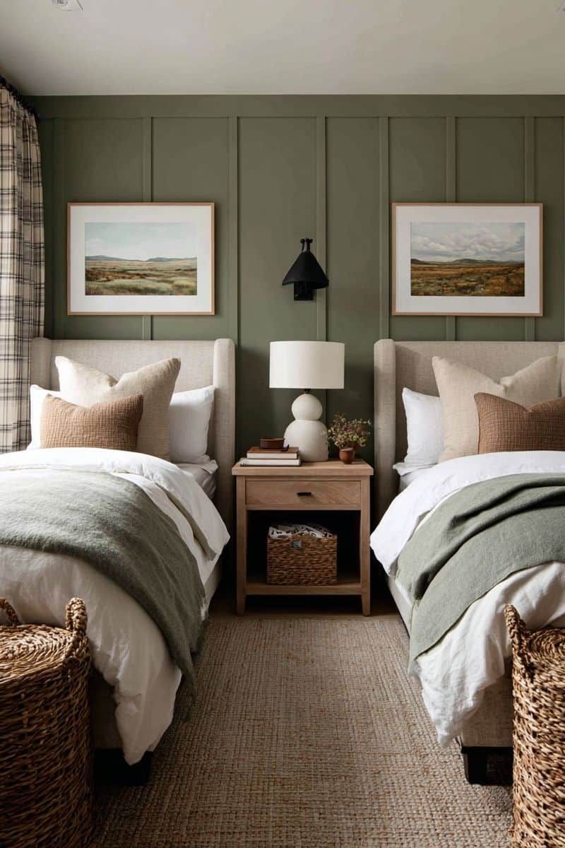 To keep this scheme contemporary, contrast is controlled and deliberate. A deeper olive or earthy bronze can be introduced through a front door, window frames or cabinetry, while natural materials such as travertine, warm concrete and pale timber add depth without visual clutter. On an exterior, this palette works beautifully with grey/green roofing tones and soft stone elements and rich timber accents creating a home that sits comfortably within its environment while still feeling architecturally current. It’s earthy, but elevated — a balance between organic warmth and clean-lined design.