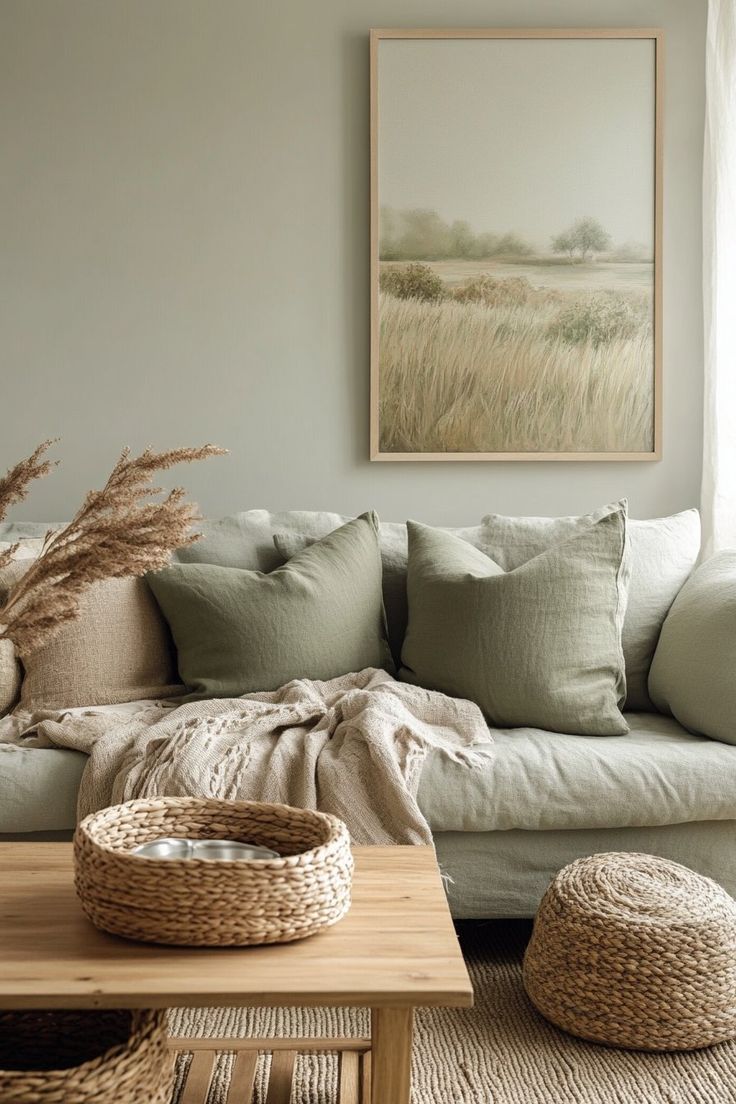 Sage green walls paired with warm whites and layered textiles (linen, wool, boucle) create a relaxed, inviting space that feels both modern and timeless.