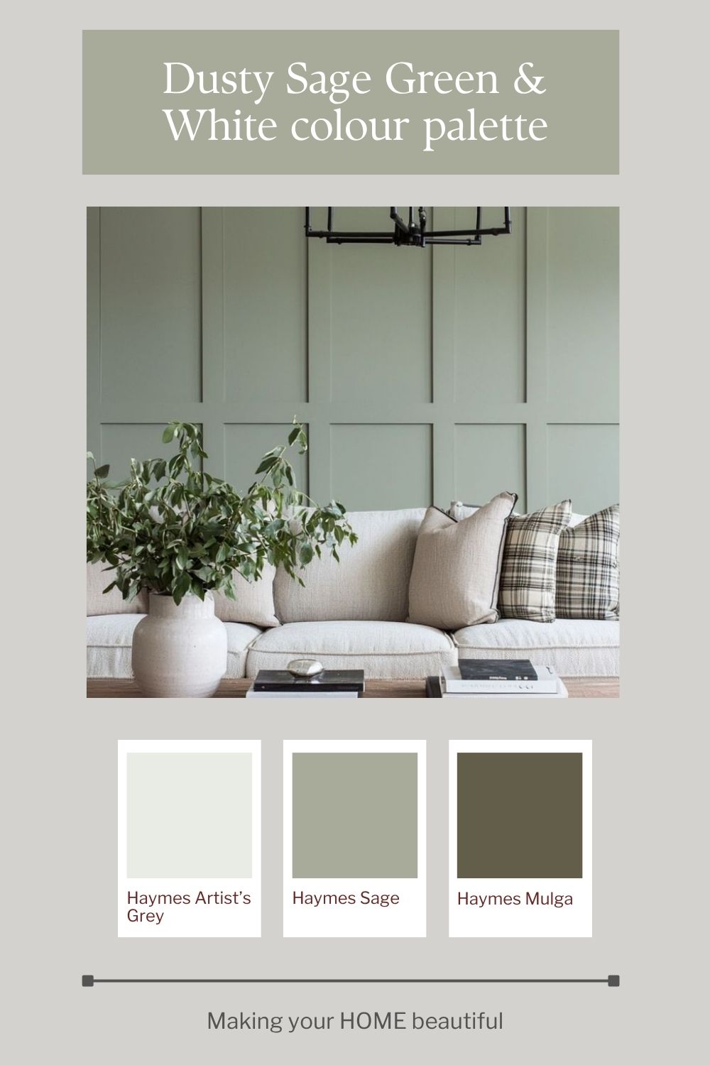 - Mid tones: Dusty sage shades like Dulux Desert Pear or Haymes Sage