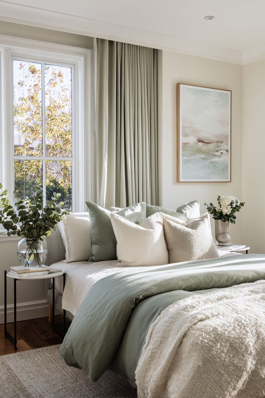 These aren’t crisp, blue-based whites. Instead, they have a subtle warmth, which is essential when working with sage tones. A cooler white would create too much contrast and disrupt the calm, tonal feel.