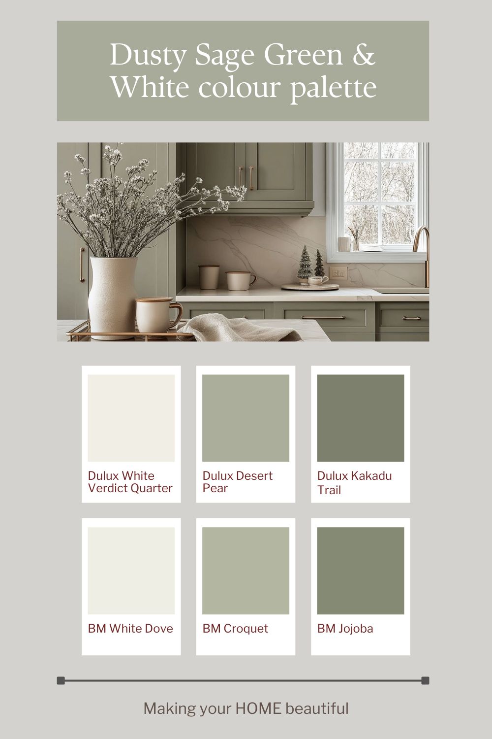 Dusty sage green and white is one of those rare palettes that feels both current and enduring. It’s gentle, versatile, and incredibly liveable — making it a perfect choice for whole-home colour schemes or individual rooms.