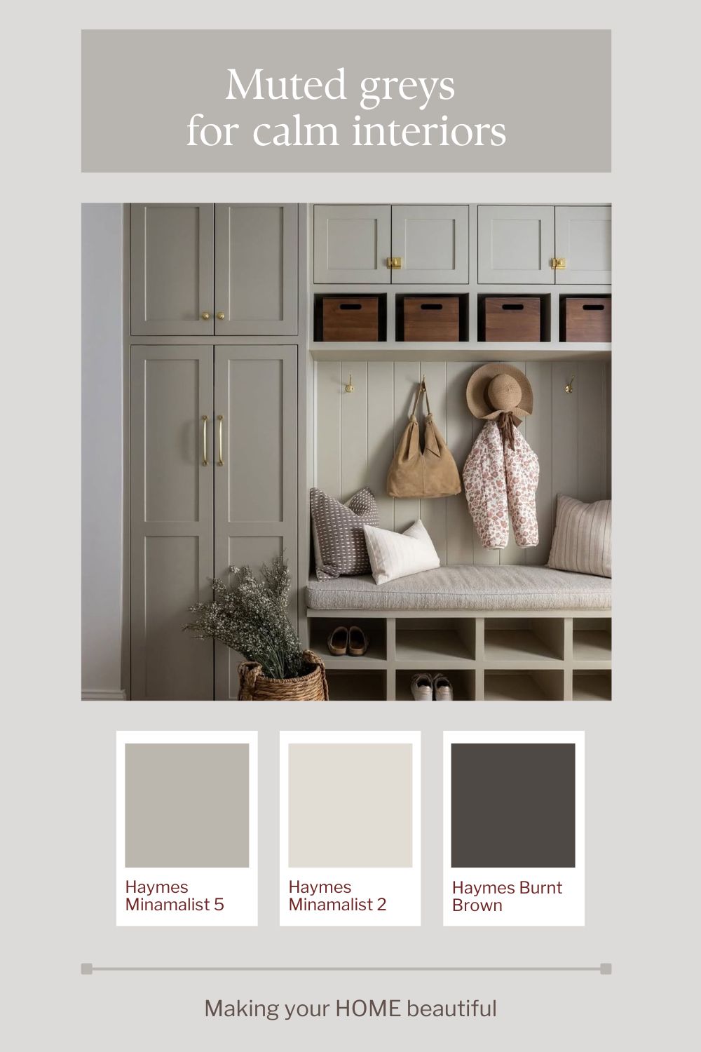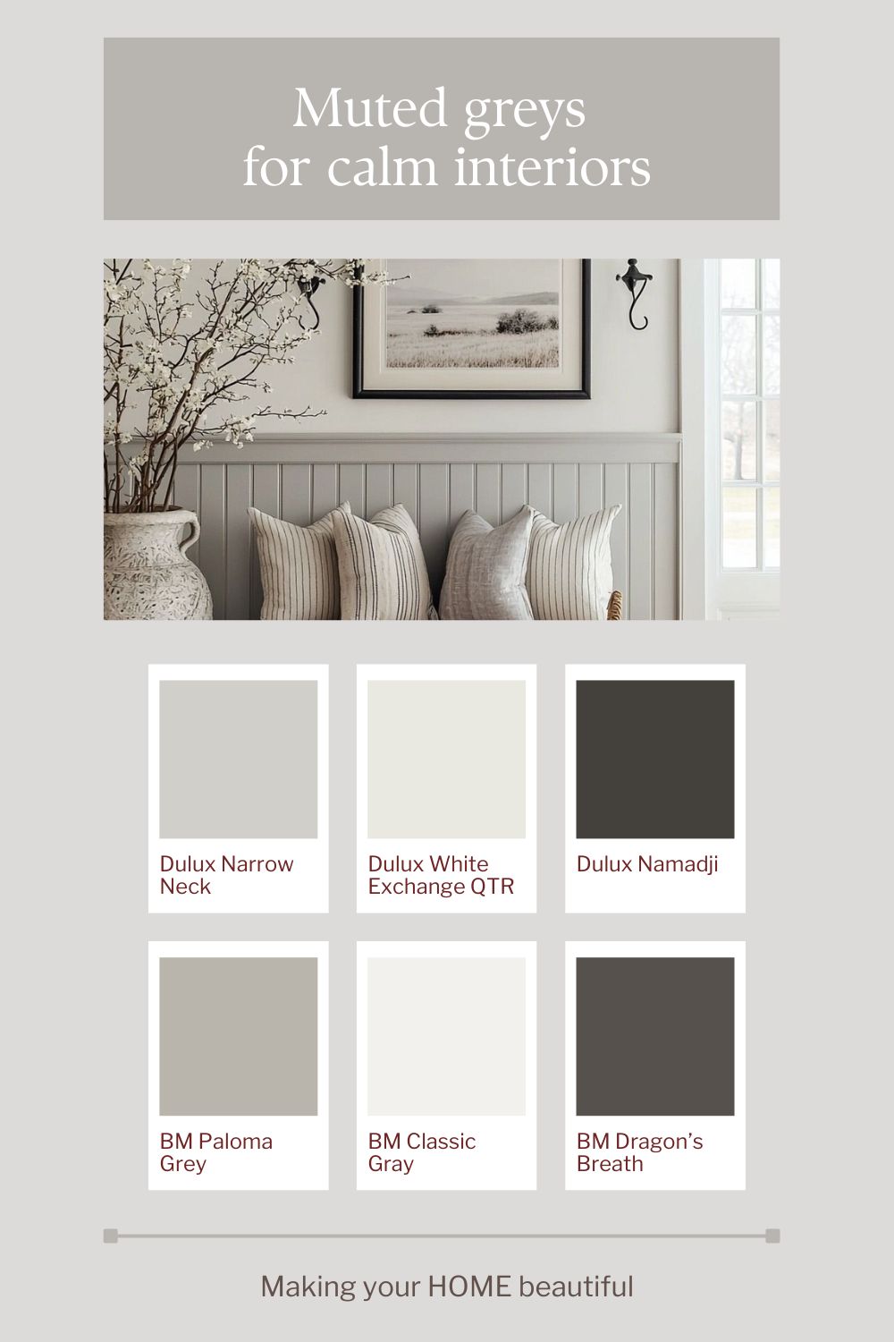 This week I am focusing on muted greys. These greys are fairly neutral in that they don't have an immediately obvious undertone. They are warm with a yellow base but with a very slight leaning towards a neutral undertone of green, they work to bring calmness to a space as the eye doesn't need to adjust to see green. Remember that with the colour wheel you can have a yellow that contains more green or more orange - these are subtle shifts but can make all the difference to a final colour.
