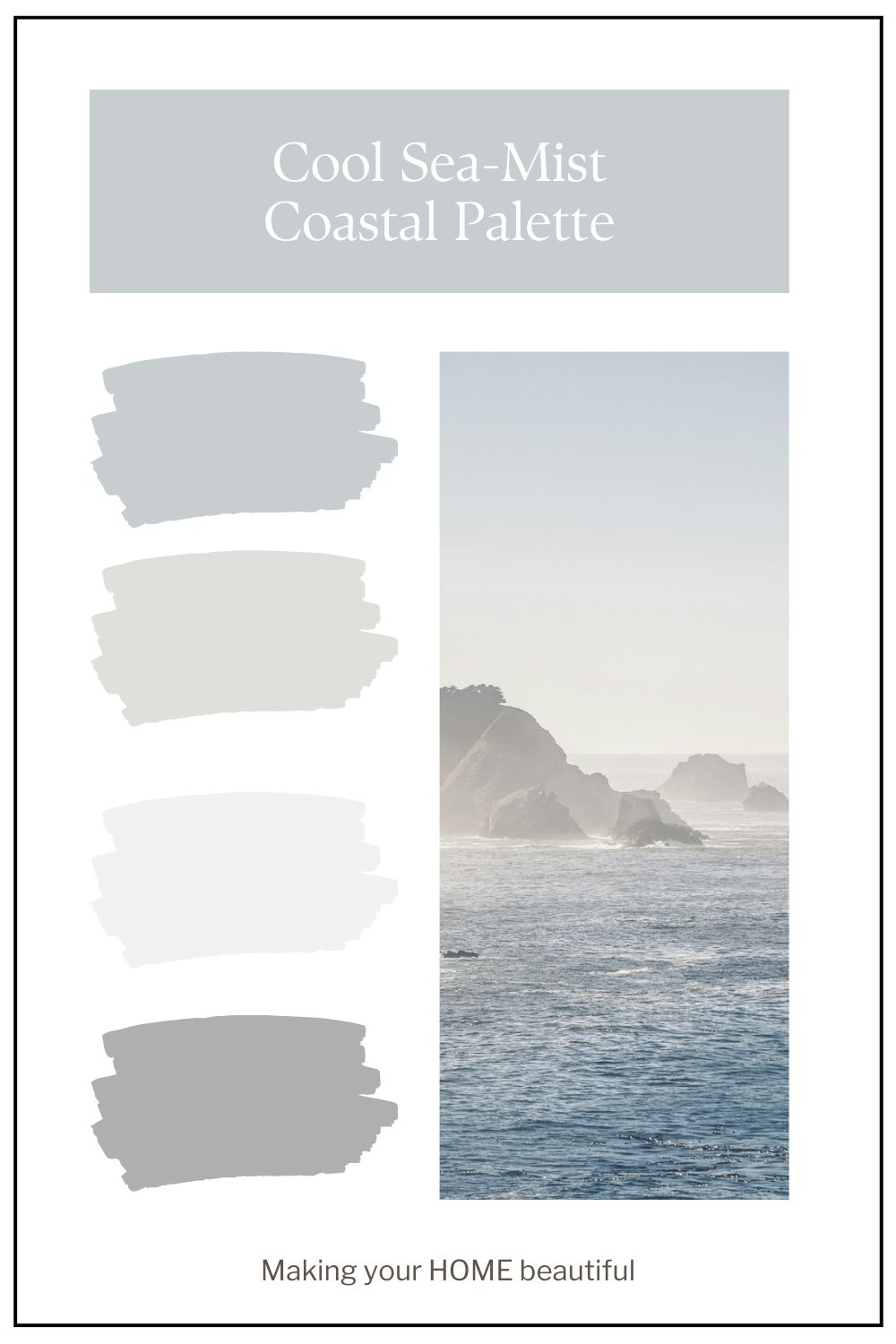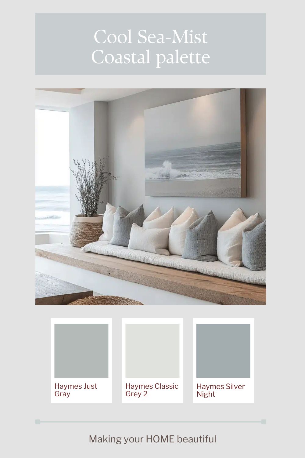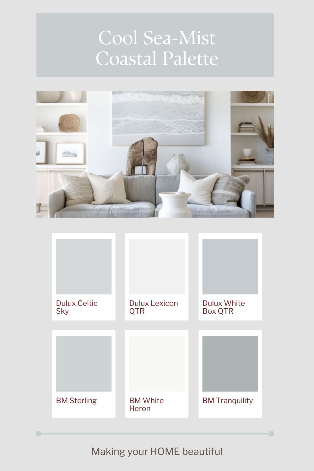 The cool sea-mist version of this palette is all about lightness and clarity. Think crisp, cool whites layered with soft silver greys and the faintest wash of blue — like morning light sitting over still water. These tones feel clean without being stark, especially when the whites have a subtle grey undertone rather than cream. The effect is calm and expansive, creating a sense of air and openness that works beautifully in homes with good natural light or coastal exposure.