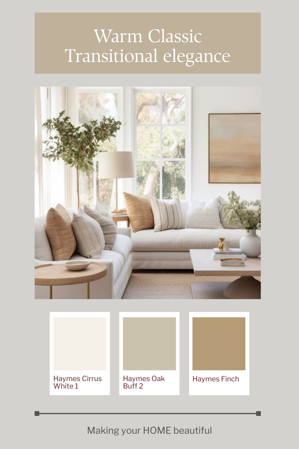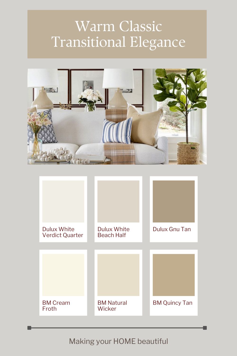 A Warm Classic Transitional palette sits beautifully between traditional comfort and contemporary restraint. It’s the type of scheme that feels timeless rather than trendy — layered, calm and quietly elegant. The colours I have selected work together because they share warm undertones and soft depth, creating a home that feels cohesive and welcoming rather than stark or overly styled.
