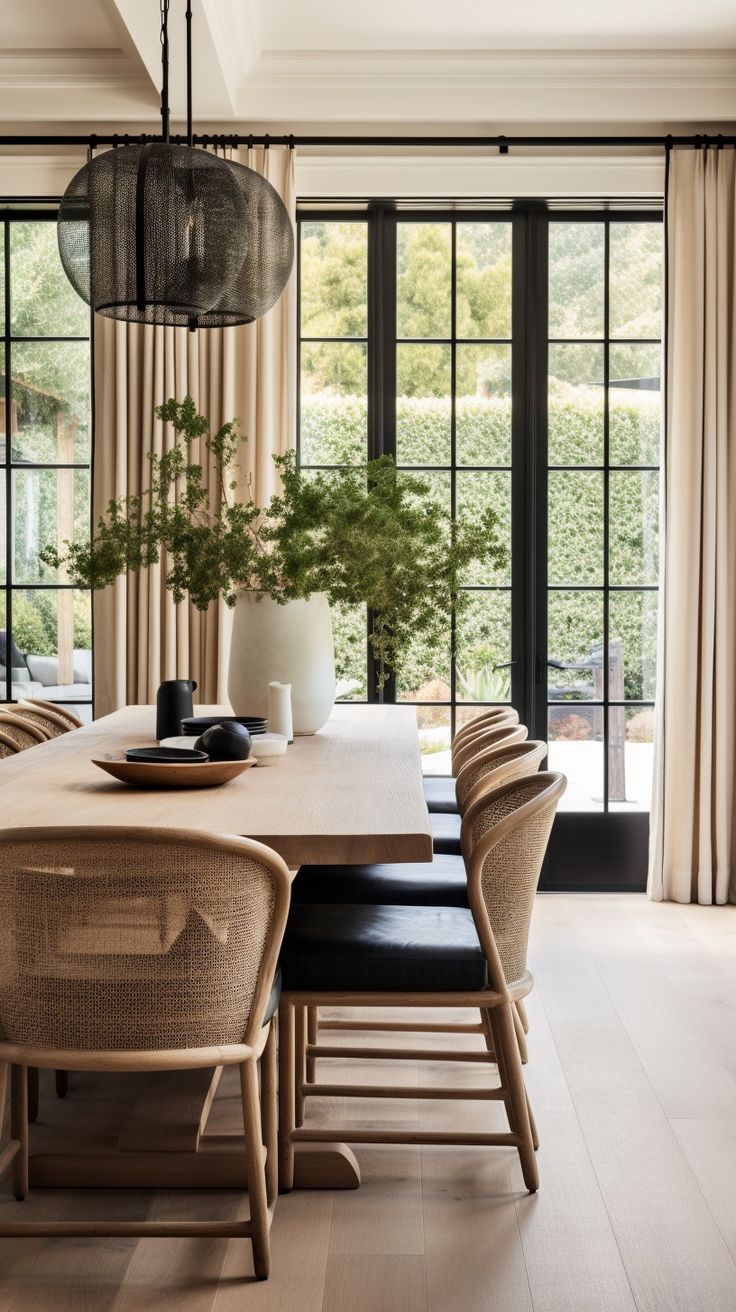- The curtains hung from a high black rod are elegant and suit the room perfectly, while the styling of the lighting and greenery is beautiful.