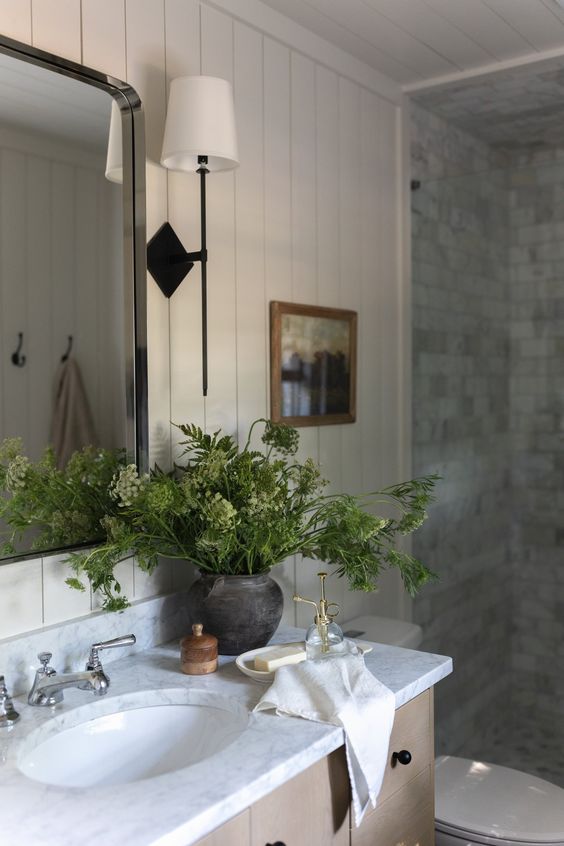 - I am a big fan of V groove panelling in bathrooms for areas that don’t get wet. It is far cheaper than tiling and the colour can easily be updated when you fancy a change. By using a classic marble in the wet areas, the room is one that will endure and can be easily modernised as tastes change.