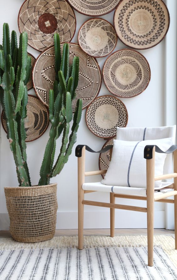 Basket weave homewares and accessories are integral to a Bohemian styled interior.