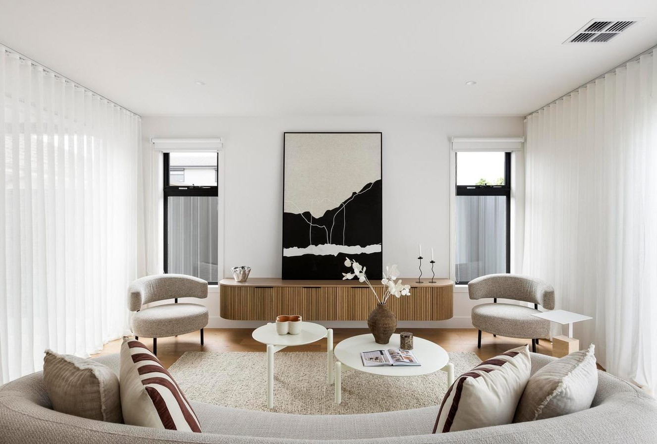 The living rooms above and below are painted in Dulux Casper White Quarter.
