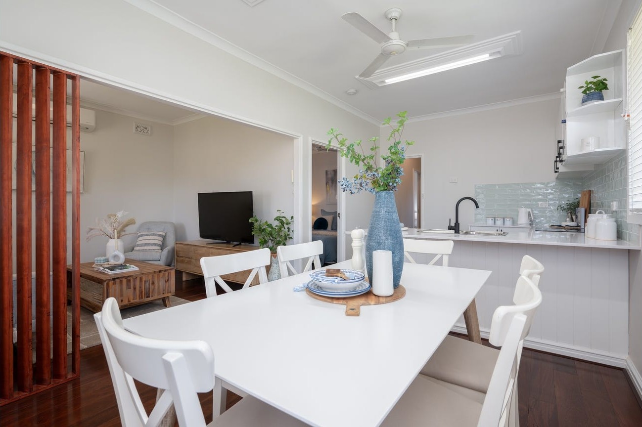 The kitchen joinery below is Polytec Blossom White shown with Dulux White Exchange Half on the walls.