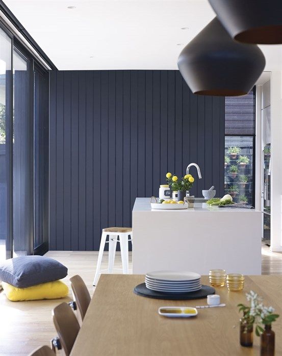 It is often considered that to achieve a relaxed coastal style look you need to decorate with light, white and breezy colour schemes. However this rich dark interior wall in a charcoal blue, which cleverly links to the exterior, brings a dramatic and moody touch without losing the coastal vibe.