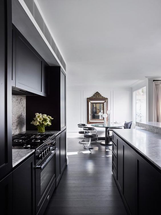 In large open plan spaces, dark colours can also be used to zone an area. In a classic interior, a dark kitchen looks more in place and ensures that the living area is bright and light. The strong tonal variation gives a timeless and classical feel to the space.