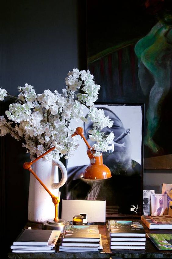 The appeal for me of a dark wall is that it provides the perfect backdrop to highlight anything placed in front of it. These white flowers come alive in this image and artworks are also very effective when hung on a dark wall.