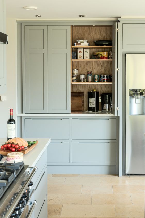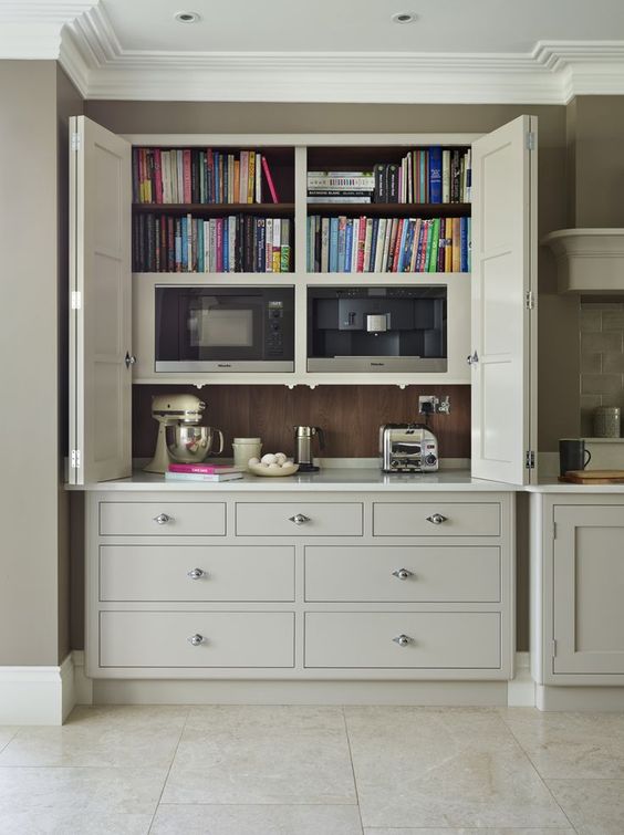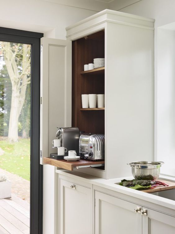Pocket doors are my favourite choice for any cupboard that you need to remain open while you use it. They are great for TV cabinets, walk in wardrobes, and of course our focus today, kitchen appliance cupboards. They must be well made though so that they seamlessly slide back into the cabinet. If they stick, your doors will be damaged in no time.