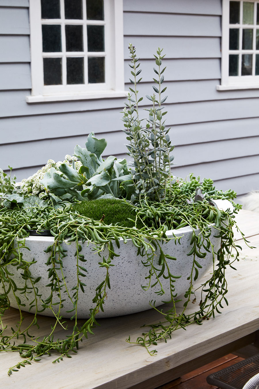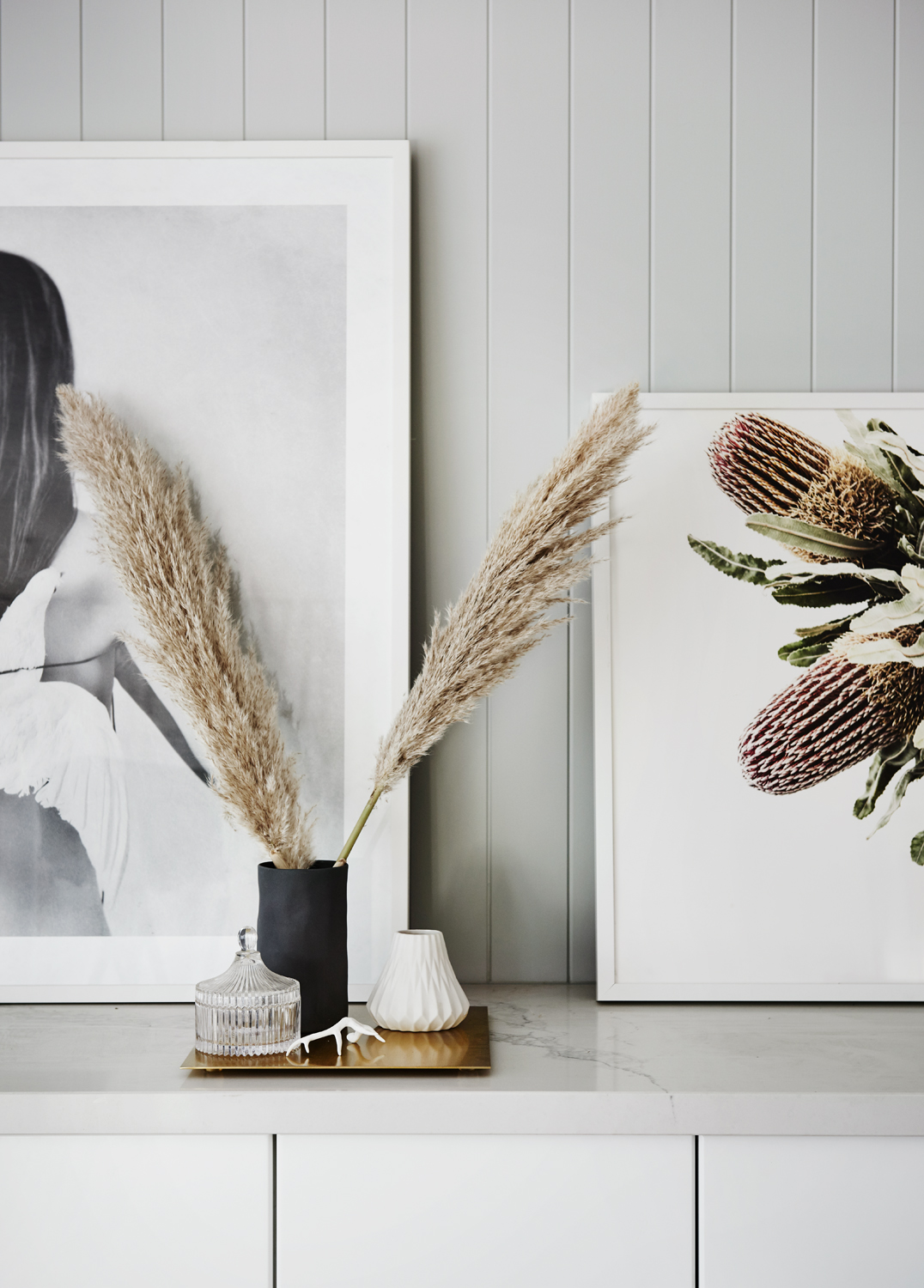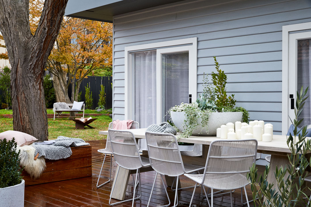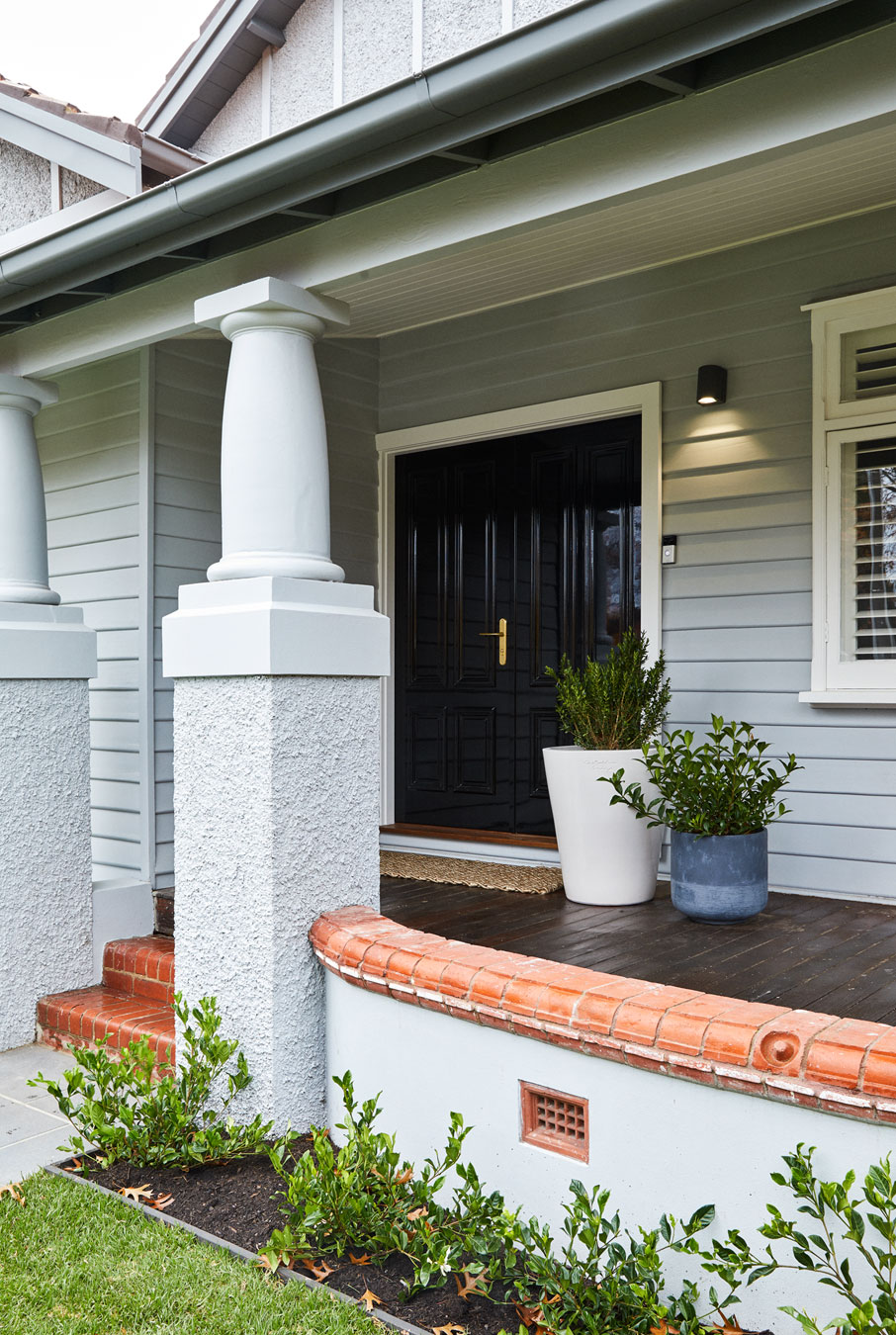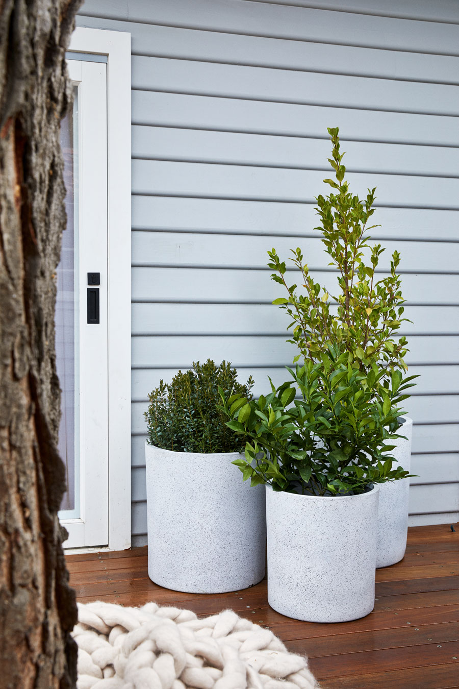 Styling is one of Norsu Interiors' specialties which is evident in the selection of outdoor pots and greenery to complement the Dulux Milton Moon weatherboards.
