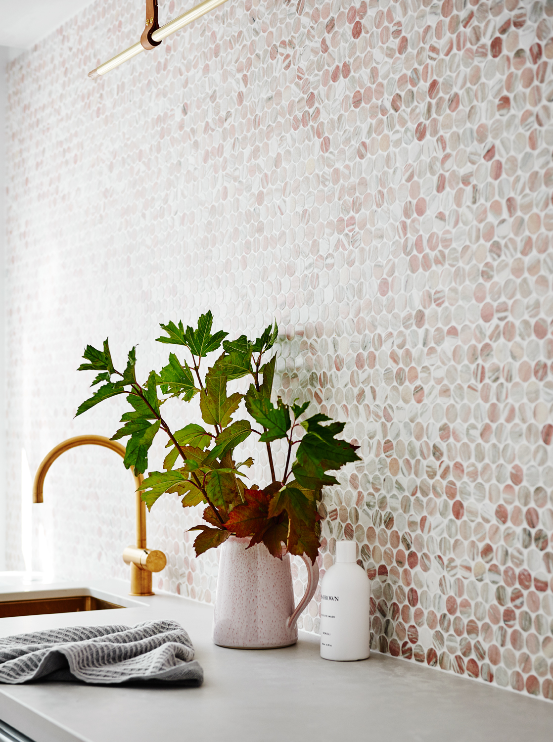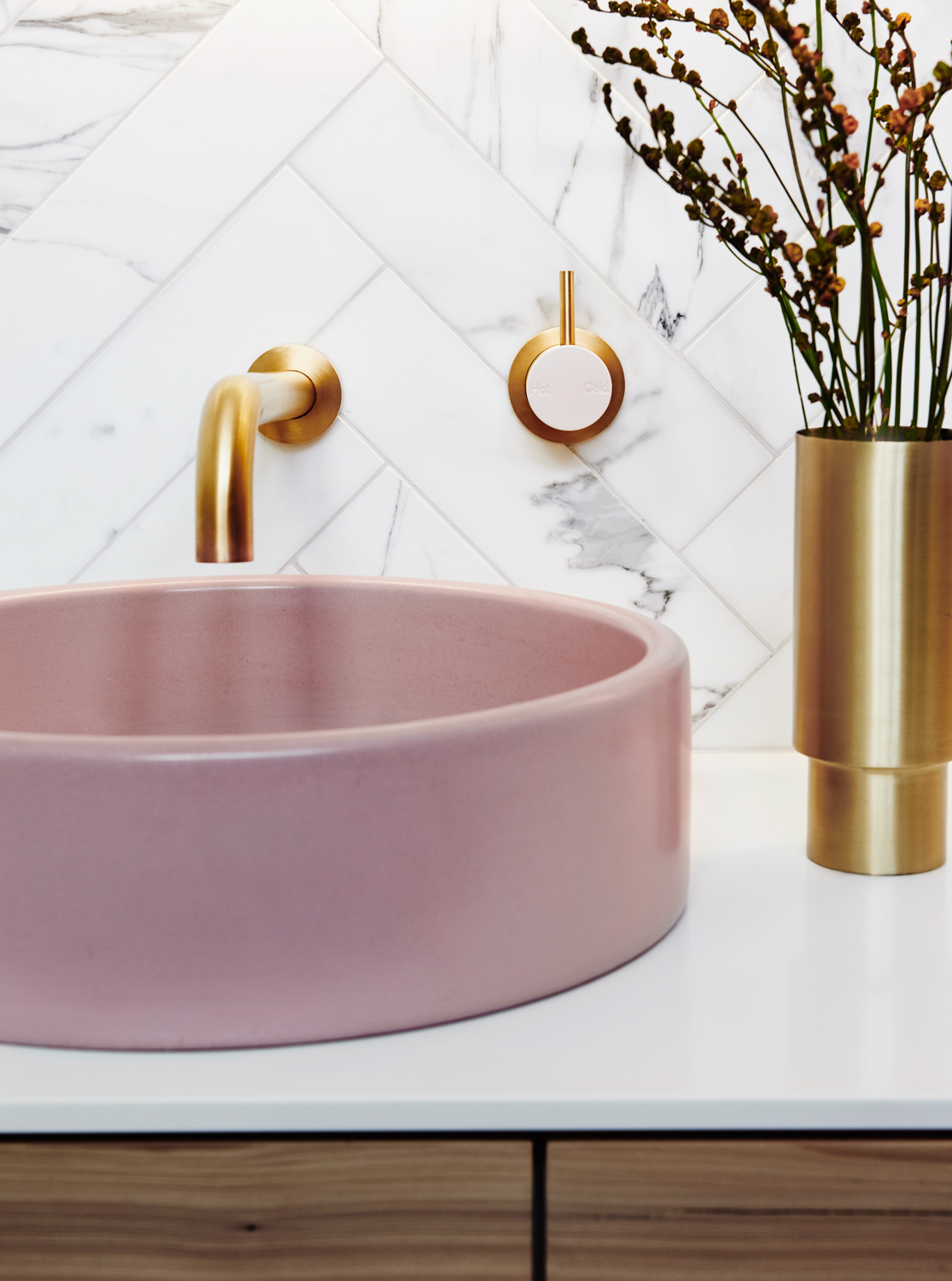 Nat's love of pink is evident throughout the house but no more so than in the bathroom. I love this welcoming look, with accents of timber and brass, the soft pink works beautifully.