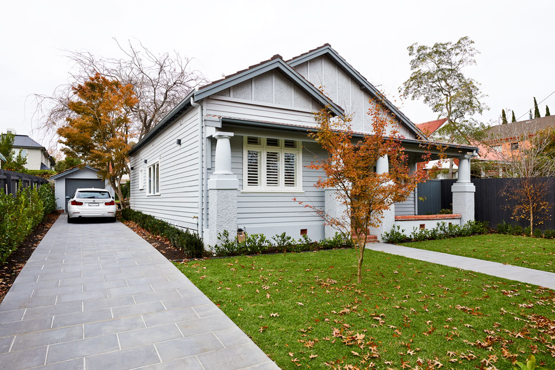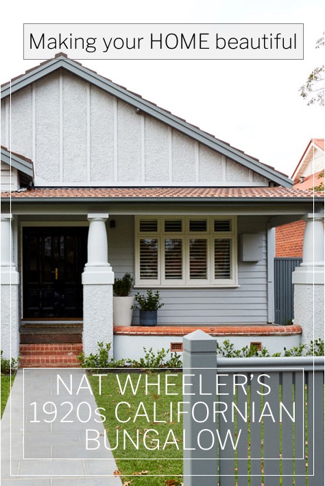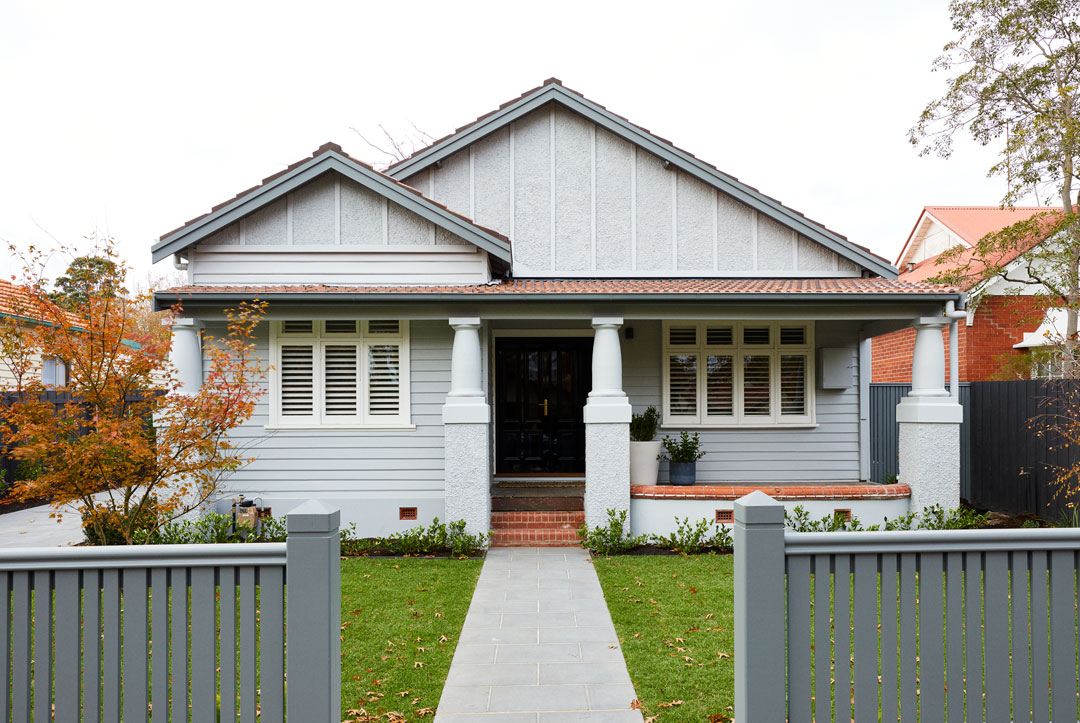 Nat used a soft grey palette for the exterior of her 1920s Californian Bungalow renovation. The colours are Dulux Teahouse for the fence, gutter and fascia with Dulux Milton Moon for the weatherboards and gable front. Completed with Dulux Natural White as a trim colour.