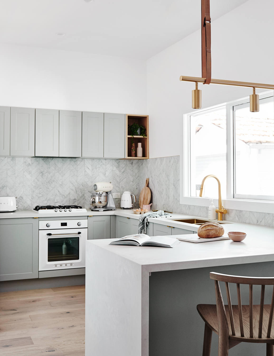 The custom kitchen cabinetry from Kaboodle is painted in Dulux Milton Moon with Caesarstone Cloudburst Concrete benchtops. This lovely soft grey colour palette has had warmth injected with the gorgeous brass tap, sink and kitchen handles.
