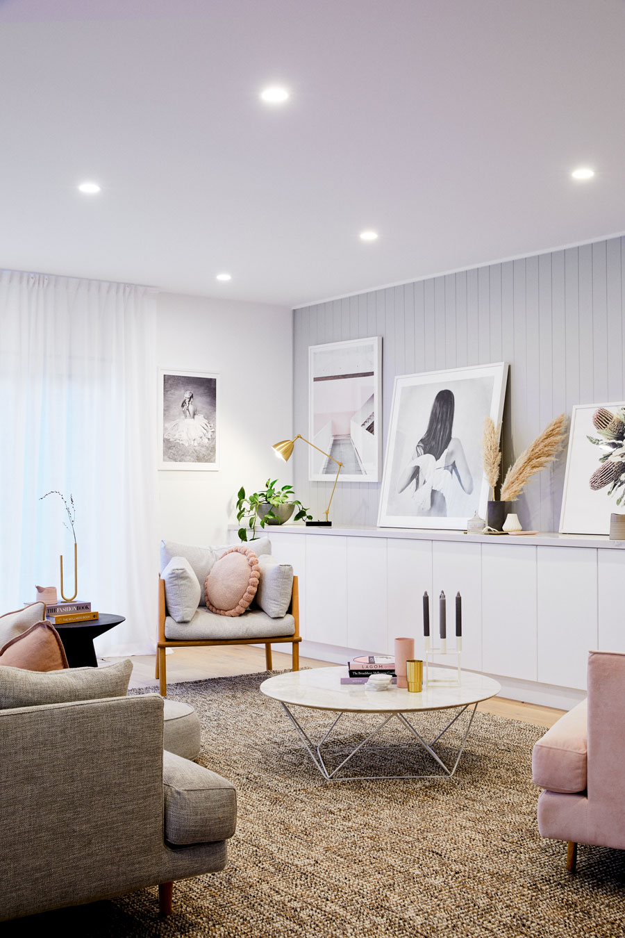 Dulux Tranquil Retreat is painted on the VJ paneling in the living room, while Dulux Vivid White has been used on other walls and custom Kaboodle cabinetry. The pale oak flooring, textured rugs and accents of soft pink and grey are hallmarks of a classic Scandi style. The home is classic enough to suit the 1920s exterior but contemporary enough to appeal to today's style.