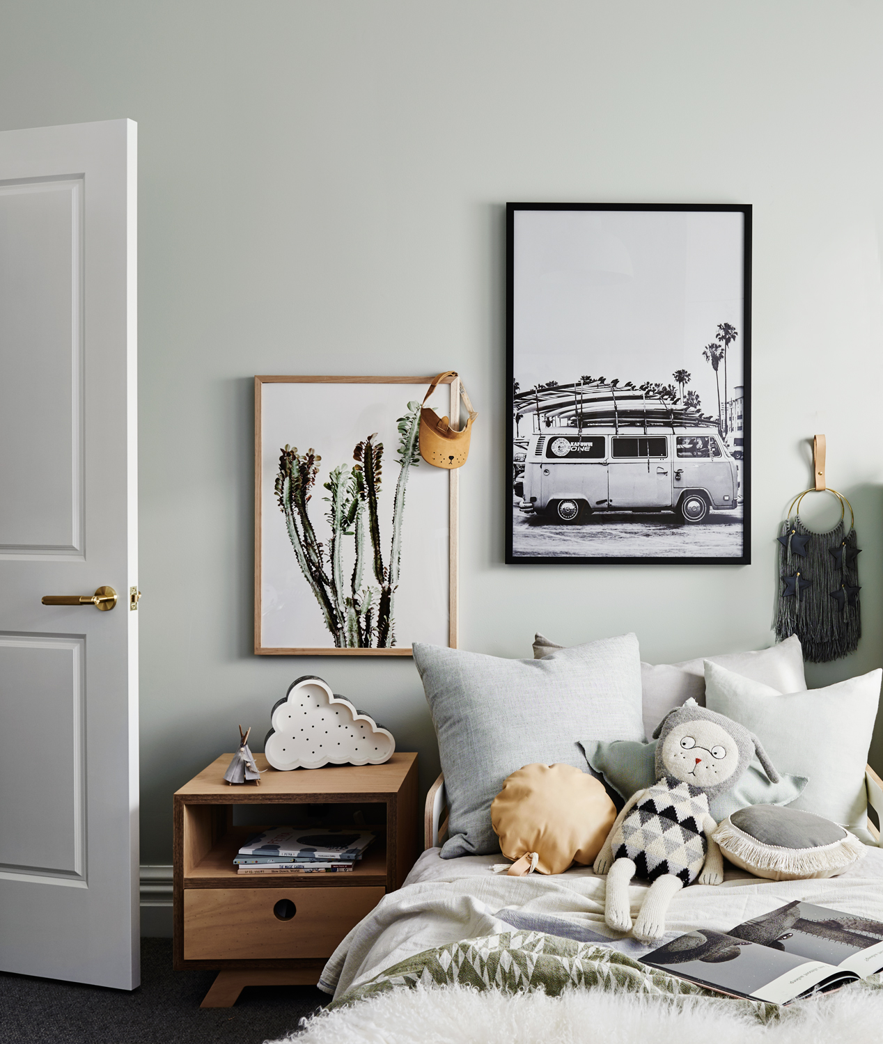 One of my favourite greys from Dulux has been used in Harvey's delightful bedroom, Spanish Olive. With it's soft green base, this grey is perfect for interiors and exteriors and suits Scandi style perfectly. Partnered with clean and fresh Dulux Vivid White for the cabinetry and trim, this is a great colour combination.