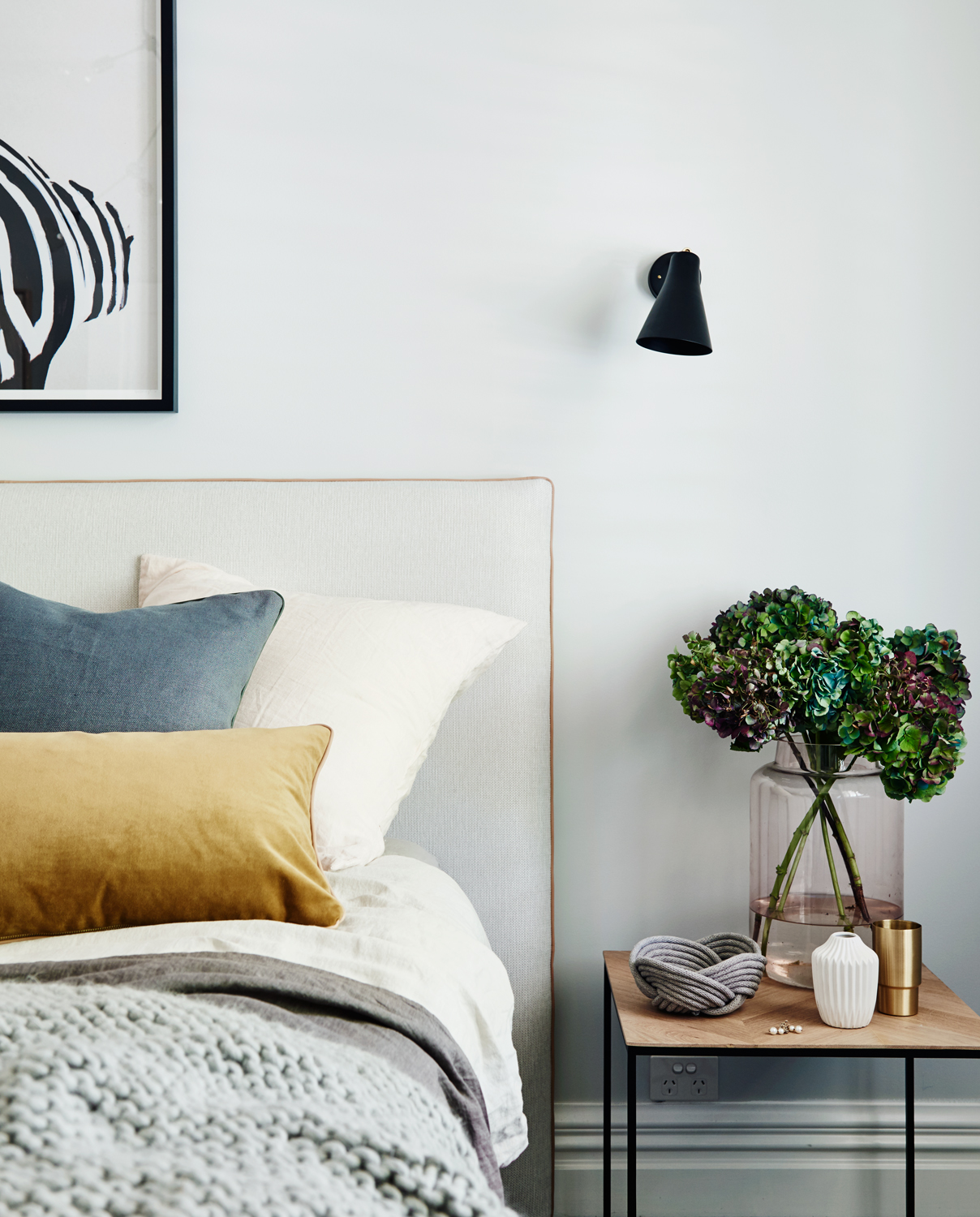 The main bedroom is serene and comfortable with a gorgeous range of different textures against a calm background of Dulux Terrace White.
