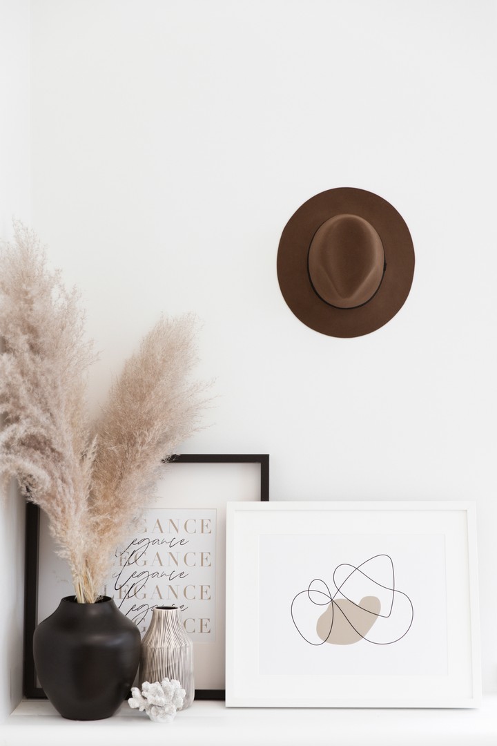 Hang at the right height. A single artwork should generally be at eye level, using the average height of a household member as a guide. When part of a vignette, you can hang it slightly lower or even prop it on furniture so it feels connected to the group.