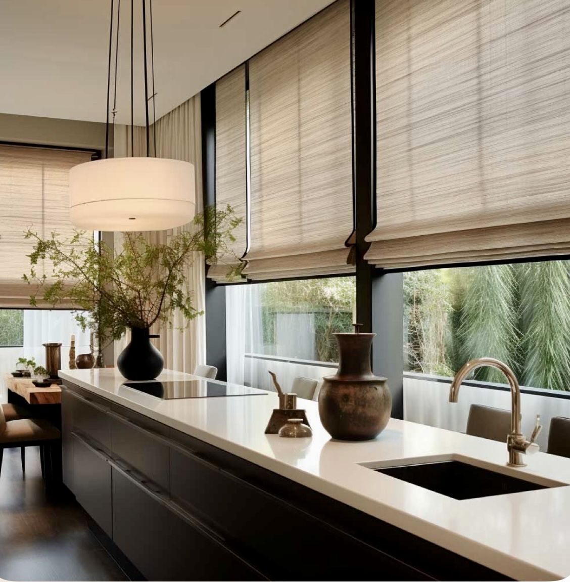 Roman blinds are also an excellent layering piece. They can be used on their own for a streamlined look or paired with sheer curtains or decorative side panels to add depth and softness to a space. This layered approach is particularly effective in open-plan homes where you want cohesion across rooms without repeating the same window treatment everywhere.